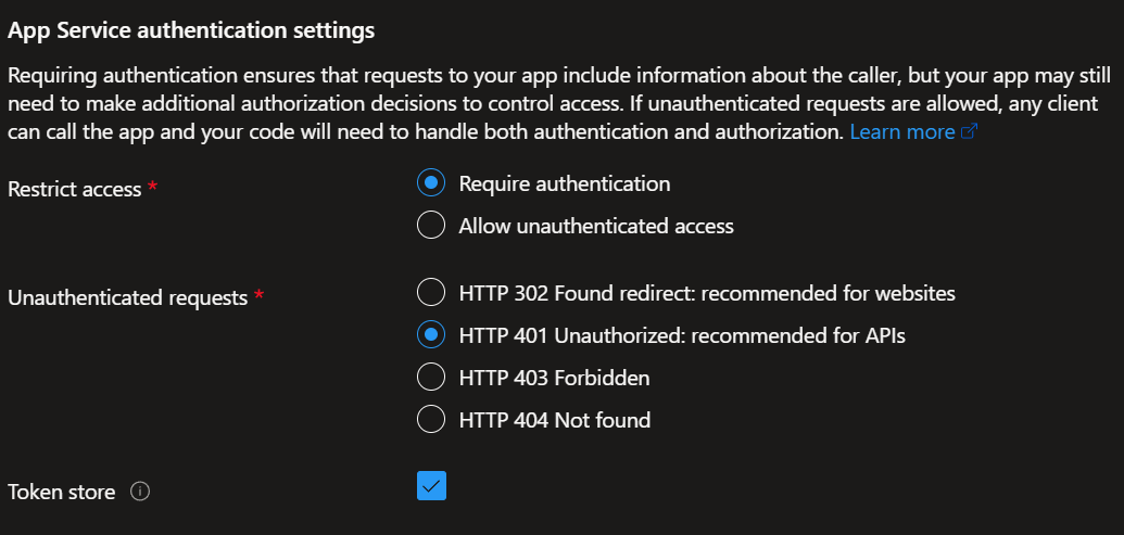 az webapp auth update --resource-group $resourceGroupName --name $functionAppName --enabled true --unauthenticated-client-action Return401